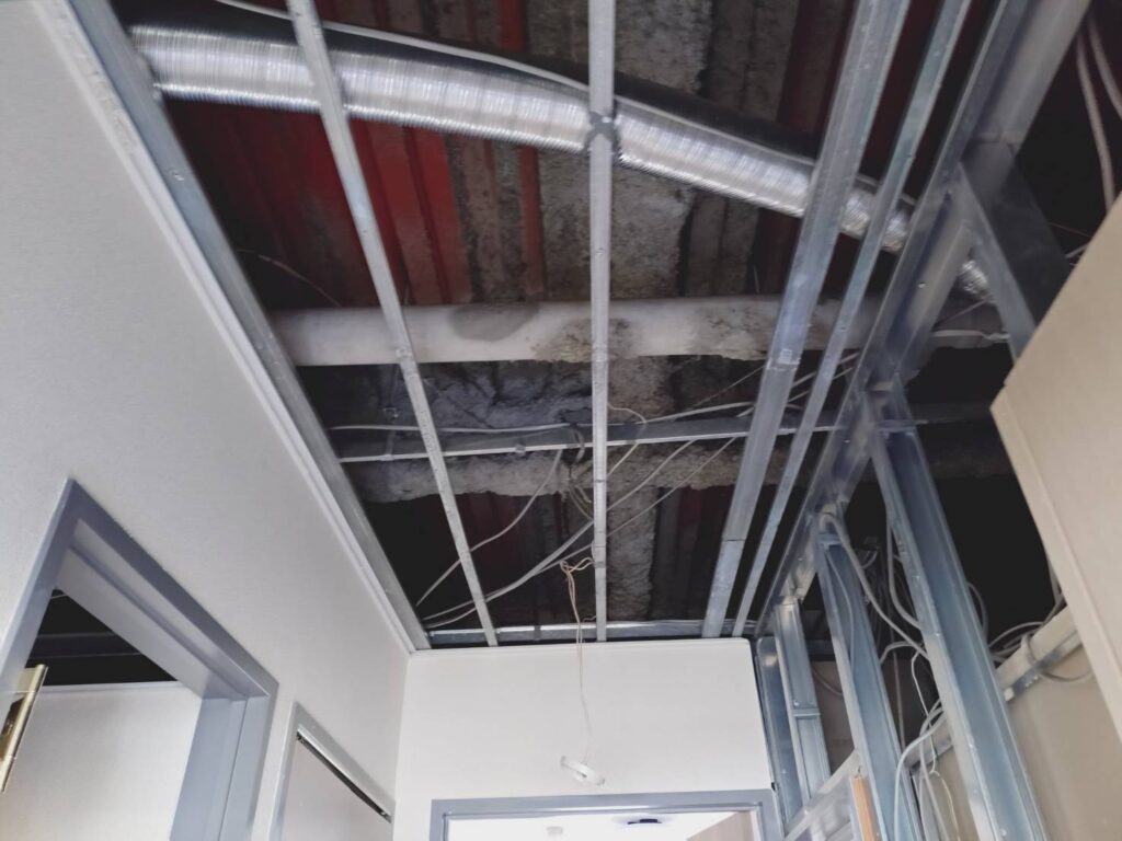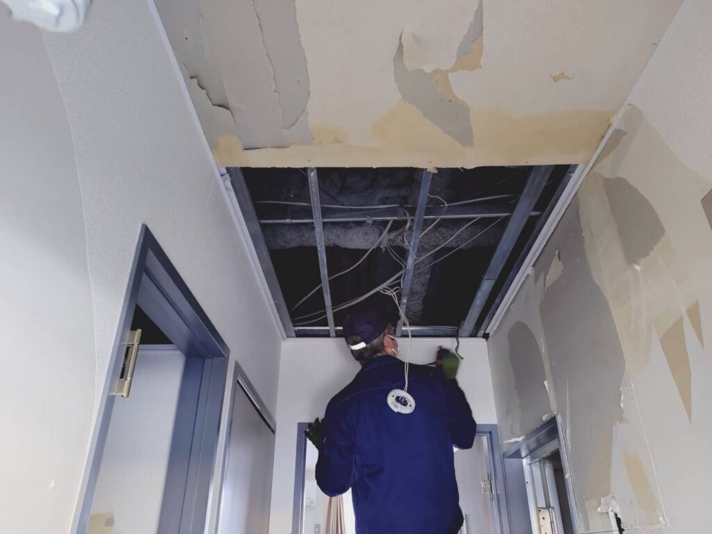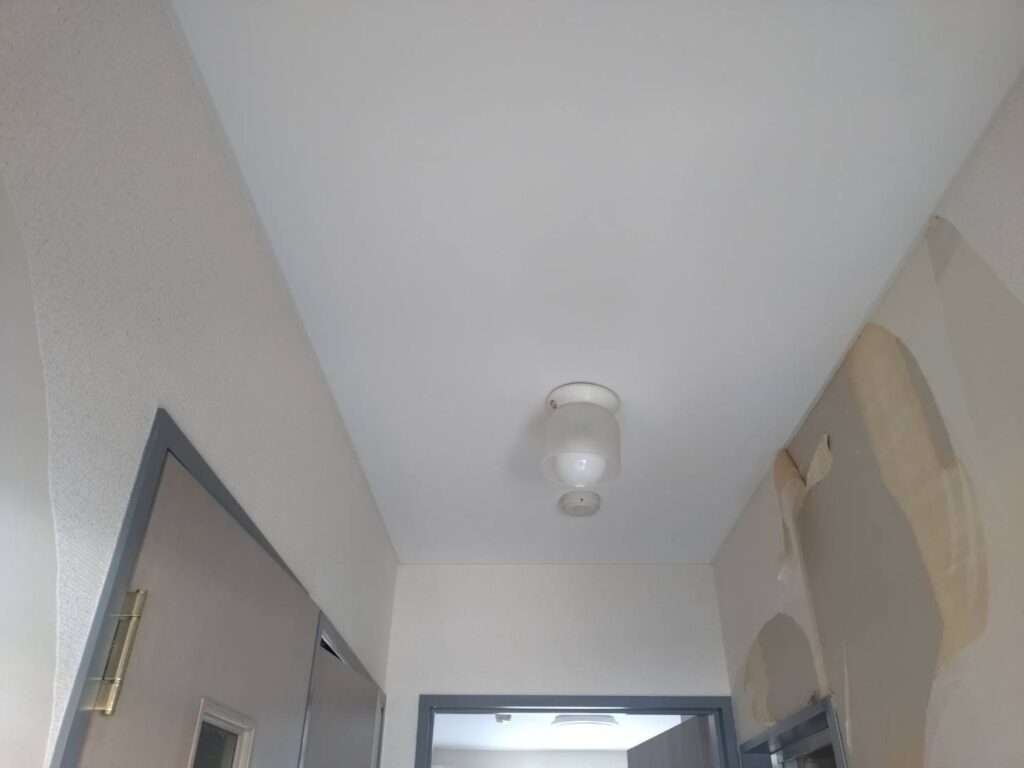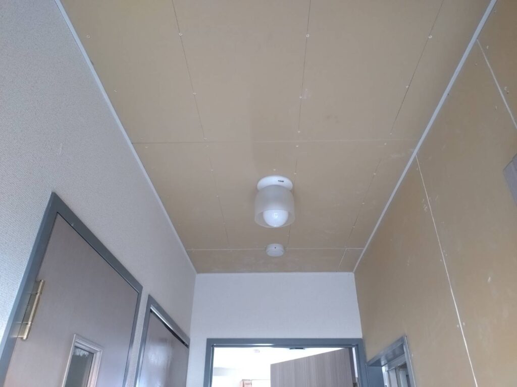 管理会社様より、上階からの水漏れによる被害のため、マンション1室のトイレ・通路の天井ボード貼替えのご依頼をいただきました。